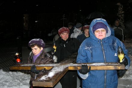 W procesji, która wyruszyła z naszego kościoła, drewniany krzyż nieśli: mieszkańcy poszczególnych przysiółków, ministranci, uczniowie ze Szkoły Podstawowej, dzieci przygotowujące się do Pierwszej Komunii Świętej, młodzież przygotowująca się do sakramentu bierzmowania, przedstawiciele grup i wspólnot modlitewnych działających przy naszej parafii - członkinie Róż Różańcowych, Akcji Katolickiej, wolontariuszki z grupy charytatywnej.
