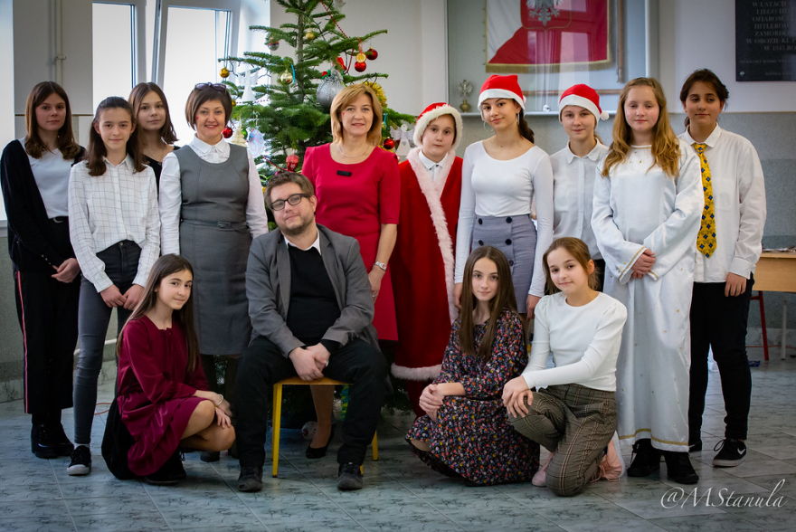 20 grudnia 2019r. był dniem szczególnym. Każda klasa z wychowawcą przygotowała spotkanie wigilijne. Na dolnym korytarzu wszyscy ubierali choinkę wieszając ozdoby w kolorach misyjnych - to inicjatywa Szkolnej Rady Uczniowskiej. Odbywał się kiermasz ozdób świątecznych - tu działali wolontariusze. Jednak najbardziej widowiskowym punktem dnia były Jasełka pt. Bóg się rodzi... Historia Bożego narodzenia opowiedziana została wg scenariusza przygotowanego przez panie: Kingę Hajduk, Adriannę Lembas i Dorotę Kabat. Aktorzy wcielili się w role aniołów, diabłów, pasterzy, królów, gwiazdeczki i oczywiście Maryi z Józefem. Nie zabrakło złego Heroda i jego damy dworu oraz śmierci, która cieszyła się na taniec z okrutnikiem. Przepiękna dekoracja, stroje, światła, muzyka, śpiew i taniec sprawiły, że zarówno uczniowie przedszkola i klas I - II, jak i starsi koledzy z klas IV - VIII przeżywali wydarzenia sprzed 2000 lat z wypiekami na twarzach.