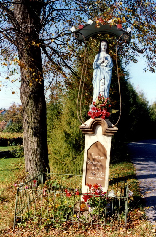 Poniżej centrum wsi, przy drodze na Bugaj, w pobliżu młyna Rzepy, na posesji Pirowskich, na kamiennym cokole umieszczono figurę Matki Bożej z Dzieciątkiem Jezus na ręku. W drugiej ręce Matka Boża trzyma berło królewskie. Figura ta została ufundowana w 1908 roku przez Marcina, Walentego i Mariana Rzepów. Poniżej figury, w kamieniu wykute są płaskorzeźby św. Marcina, z prawej strony wizerunek św. Walentego, patronów fundatorów, z lewej figura św. Anny.